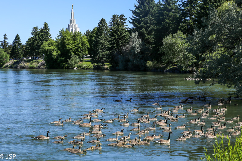 Keliamės ir vėl anksti, šeštą einame pusryčių, o septintą jau paliekame Sandy. Salt Lake City tik apvažiuojam aplinkkeliu (lyg ir mačiau iš tolo tą garsiąją Mormon Temple, bet nesu tikra) ir sukam link bulvių valstijos – Idaho. Maždaug po trijų valandų pasiekiam Idaho Falls ir trumpam stabtelim pailsėti beigi kojas pramankštinti po ilgo sėdėjimo mašinoje. Miestukas visai jaukus. Pasivaikštom po parką upės pakrantėje, pažiopsom į kriokliukus ir į žąsis su būriais žąsiukų, pasidairom po vietinį turgelį ir judam toliau.