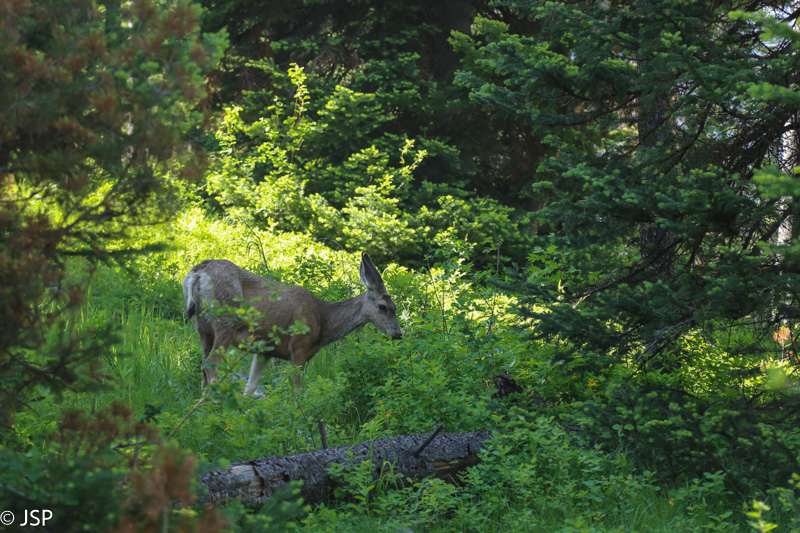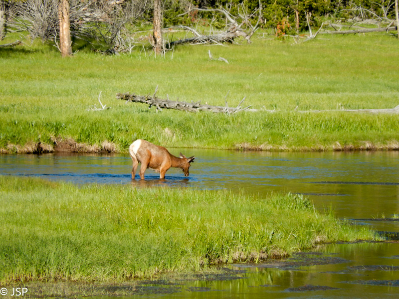 Užmatę šalikelėje sustojusias kelias mašinas, stojam ir mes. Netoliese į upę įsibridęs baltauodegis elnias (elk). Šie elniai turi dar vieną, gražesnį vardą – wapiti. Tiesa, kažkurioje indėnų tarmėje tas žodis reiškia tiesiog „baltas užpakalis“. Kartais geriau nesiaiškinti, ką reiškia tie paslaptingai skambantys vardai…