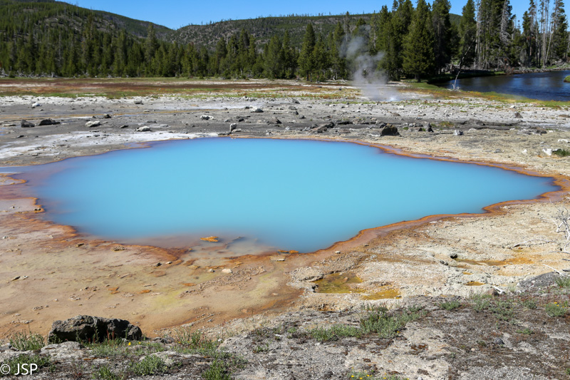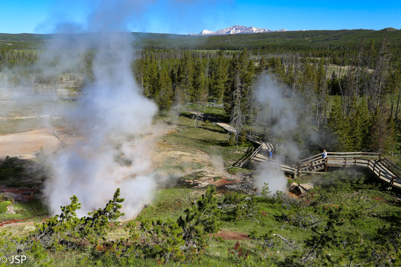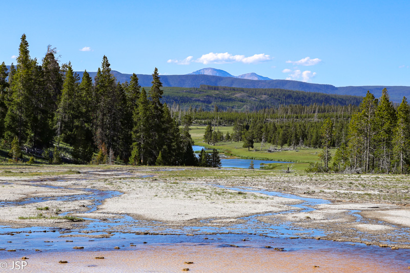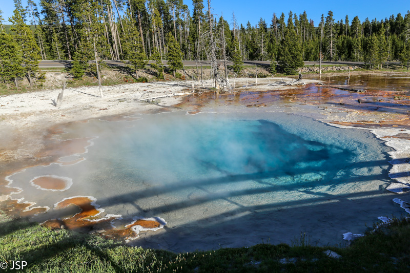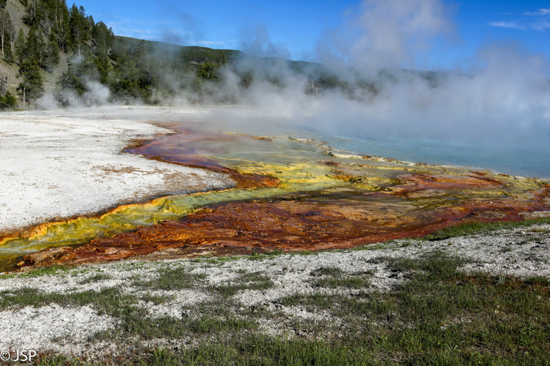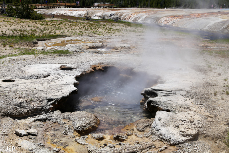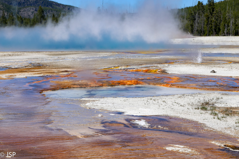 Pirmasis sustojimas – Black Sand Basin. Čia įvyksta pirmoji artimesnė mano pažintis su Yellowstone geizeriais, karštaisiais šaltiniais ir kitais geoterminiais dariniais, kurių taip gausiu šiame ypatingame gamtos kampelyje. Ir iškart išgaruoja visas skepticizmas – o jo, prisipažinsiu, buvo nemažai. Nors jau seniai norėjau pamatyti Yellowstone, bet mane labiau traukė gamta ir gyvūnai, norėjosi pamatyti tas bekraštes erdves, na o geizeriai… galvojau, kas jau čia tokio ypatingo tie geizeriai, išskyrus kelis pačius pačiausius, kuriuos tikrai noriu pamatyti, bet iš esmės taigi tik dūmai ir karštas vanduo, baisus čia daiktas… Bet kai savo akim matai tą keistą peizažą ir visus tuos rūkstančius, garuojančius, šnypščiančius, burbuliuojančius visokių spalvų ir formų darinius, o už jų tolumoje žaliuoja eglynai, visai šalia teka rami šiaurietiška upė, viskas lyg ir normalu, bet lyg ir ne visai (nes pvz upės vanduo tai šiltas!) – tai tikrai savotiškas jausmas apima, lyg į kokią alternatyvią realybę būtum patekęs.