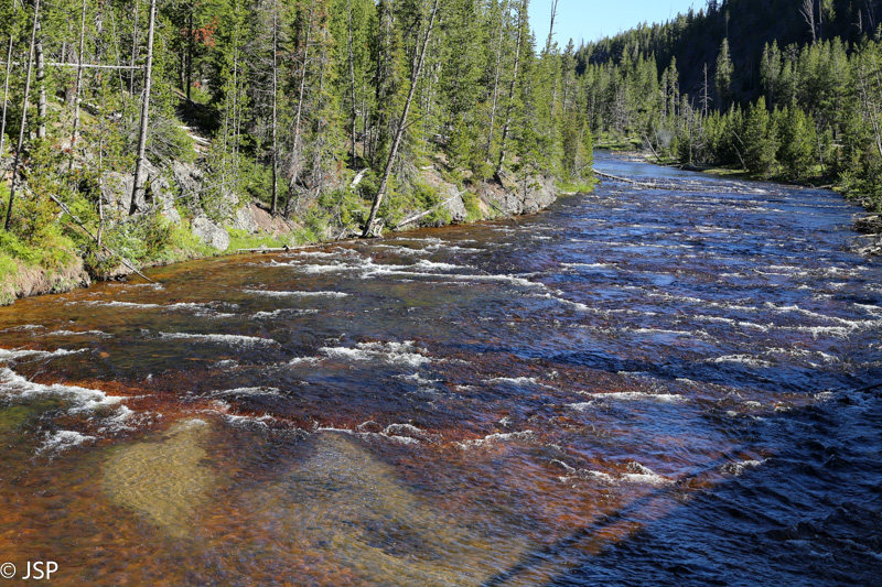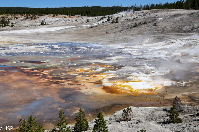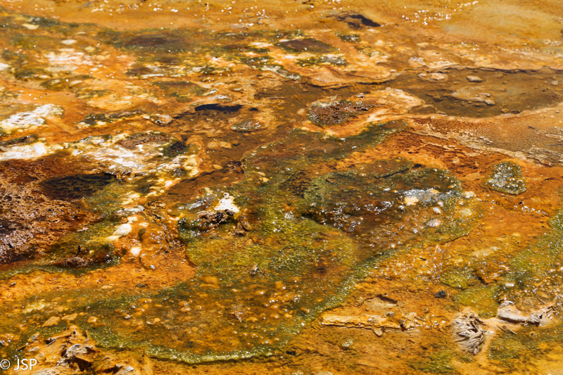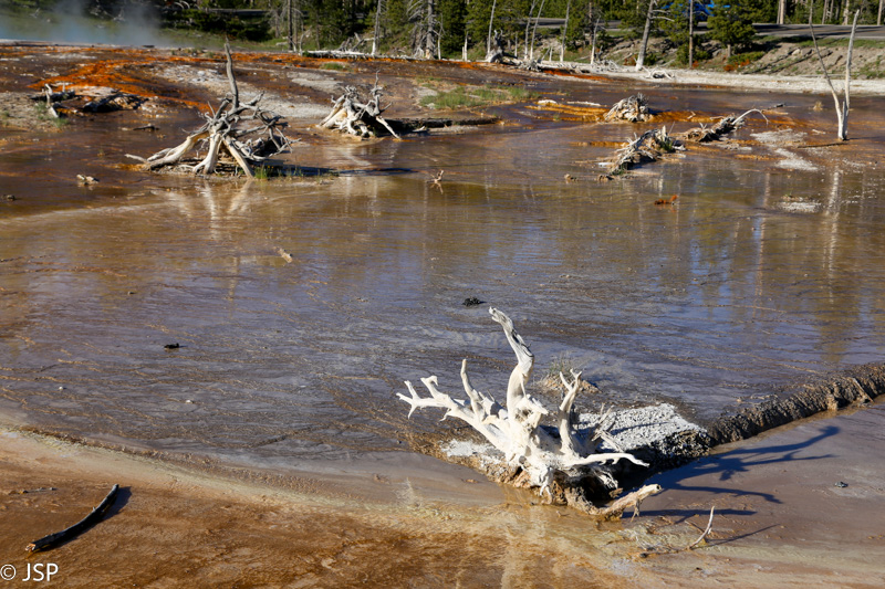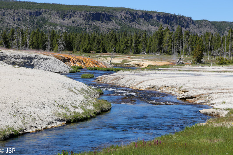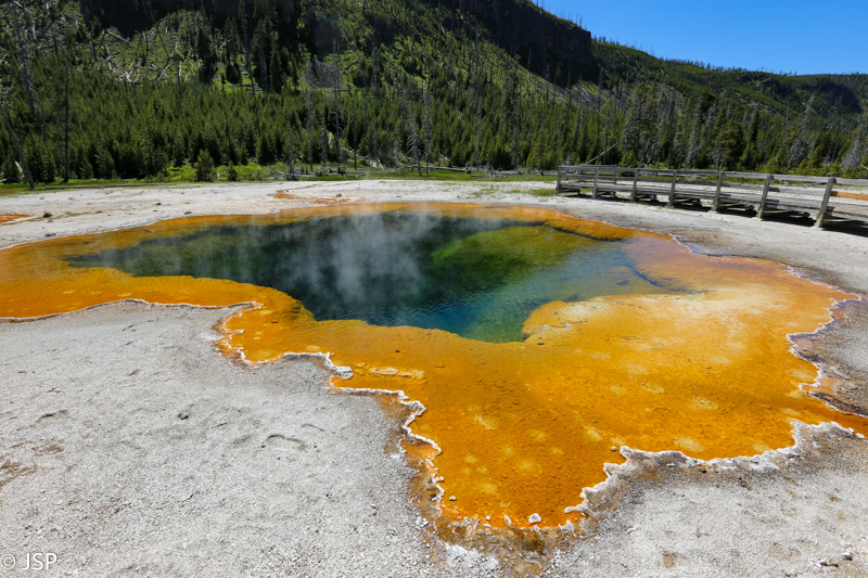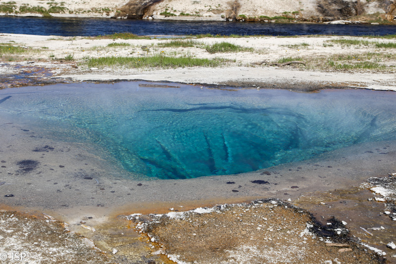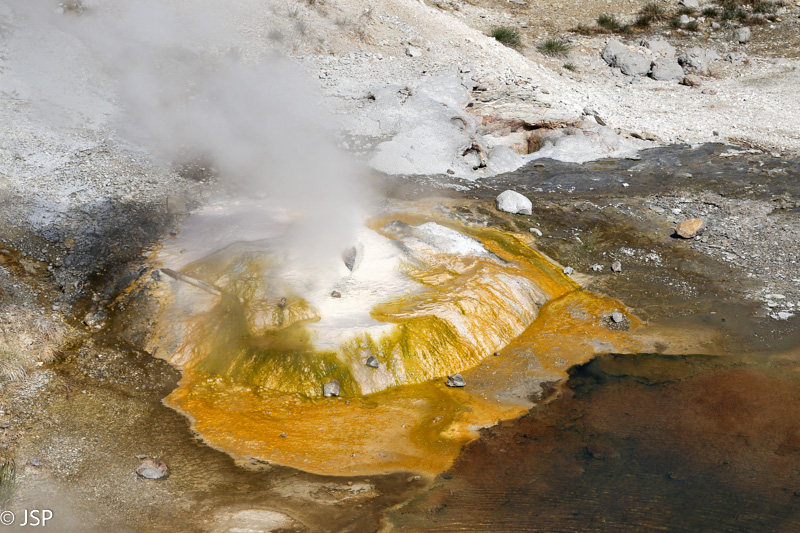 Pirmasis sustojimas – Black Sand Basin. Čia įvyksta pirmoji artimesnė mano pažintis su Yellowstone geizeriais, karštaisiais šaltiniais ir kitais geoterminiais dariniais, kurių taip gausiu šiame ypatingame gamtos kampelyje. Ir iškart išgaruoja visas skepticizmas – o jo, prisipažinsiu, buvo nemažai. Nors jau seniai norėjau pamatyti Yellowstone, bet mane labiau traukė gamta ir gyvūnai, norėjosi pamatyti tas bekraštes erdves, na o geizeriai… galvojau, kas jau čia tokio ypatingo tie geizeriai, išskyrus kelis pačius pačiausius, kuriuos tikrai noriu pamatyti, bet iš esmės taigi tik dūmai ir karštas vanduo, baisus čia daiktas… Bet kai savo akim matai tą keistą peizažą ir visus tuos rūkstančius, garuojančius, šnypščiančius, burbuliuojančius visokių spalvų ir formų darinius, o už jų tolumoje žaliuoja eglynai, visai šalia teka rami šiaurietiška upė, viskas lyg ir normalu, bet lyg ir ne visai (nes pvz upės vanduo tai šiltas!) – tai tikrai savotiškas jausmas apima, lyg į kokią alternatyvią realybę būtum patekęs.