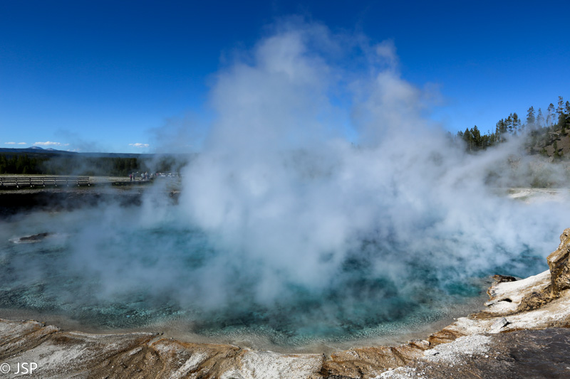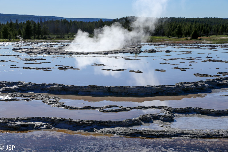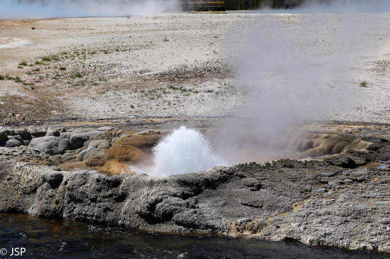 Po maždaug dešimties minučių prieiname Steamboat geizerį. Kaip tik pataikome į išsiveržimą. Jis, tiesa, neypač galingas ir vandens srovės aukštis į Gineso rekordų knygą tikrai nepateks, bet vis tiek įdomu stebėti šį vyksmą. Kiek toliau esantis Cistern Spring požeminiais šaltiniais sujungtas su Steamboat, ir po ypač stipraus Steamboat išsiveržimo Cistern Spring visiškai nusenka, kad pamažu vėl užsipildytų per porą dienų.