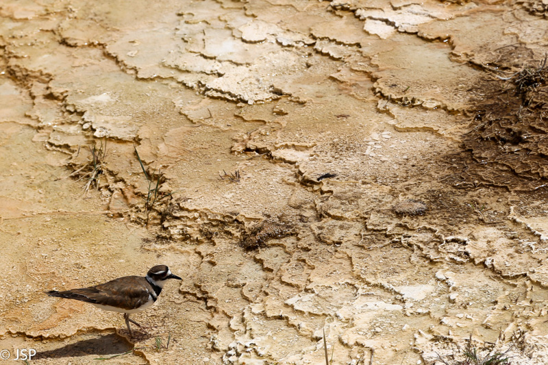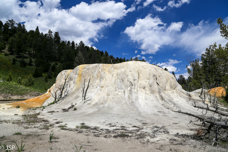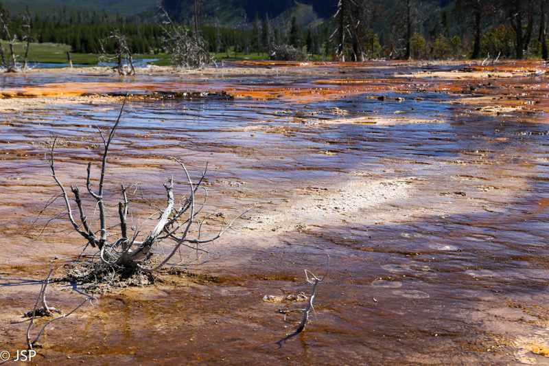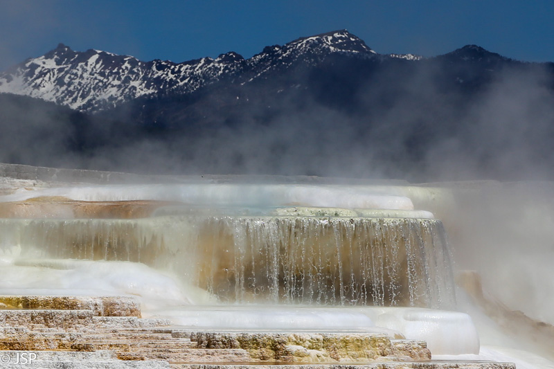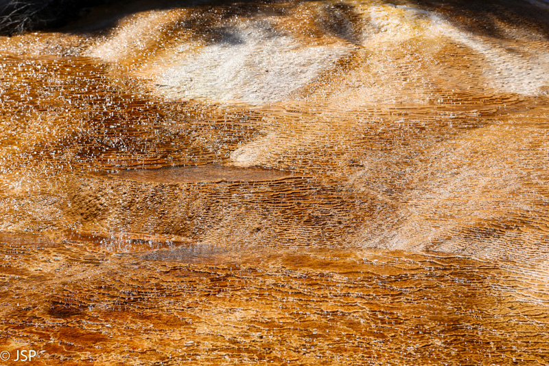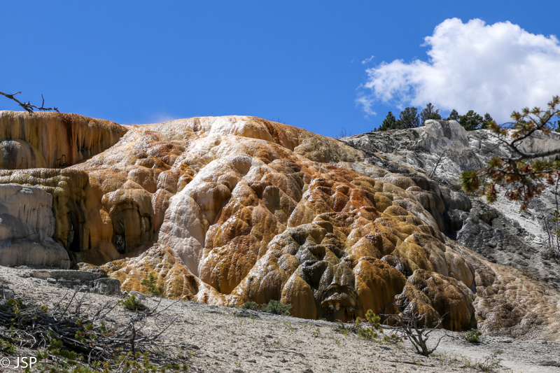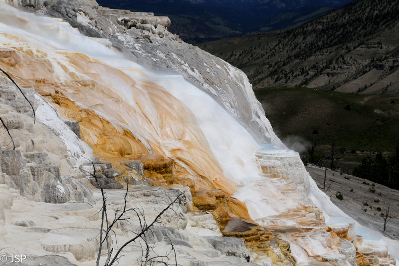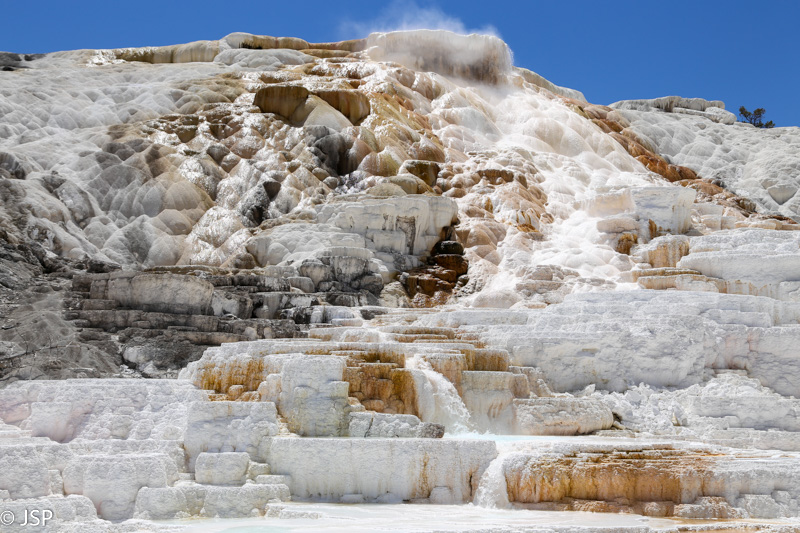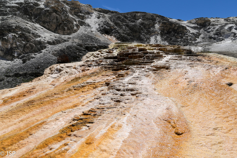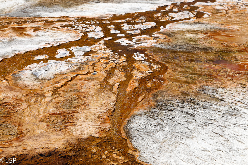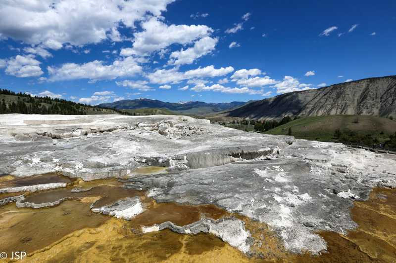 Apie pusę pirmos pasiekiame Mammoth Hot Springs. Pravažiuojame Aukštutines terasas (Upper Terraces), bet jos mums pasirodo nelabai įdomios – nematome nei vieno aktyvaus šaltinio, taigi negaištame ir važiuojame prie Žemutinių terasų (Lower Terraces). Sustojame aikštelėje terasų viršuje (Lower Terraces galima pasiekti nuo Upper Terrace Drive). Apsidairome, ir nusprendžiame, kad verta patyrinėti šią vietą iš arčiau. Pirmiausia sukame taku į dešinę – žemyn leisimės vėliau, jei dar noro ir laiko bus. Kalkakmenio ir karšto vandens sąveika čia sukūrė fantastiškų formų ir spalvų darinius.