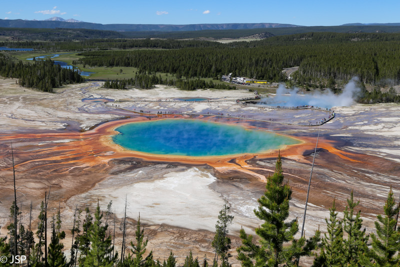 Netrukus pamatom ir kalvą – paklysti neįmanoma, nuo pagrindinio tako į kairę atsišakoja miško takelis, telieka jį sekti kalvos šlaitu aukštyn. Deja, netrukus takelio nebelieka, o šlaitas labai status, slidus (žvyras) ir nuklotas didžiuliais nuvirtusių eglių kamienais. Lipti viršun tikrai nelengva, o apie leidimąsi žemyn nei galvoti nesinori. Kartu kopia būrys kiniečių, bet daugiau turistų nesimato. Šio tako nėra oficialiame parko puslapyje – iš esmės net ir oficialaus tako nėra, nors nežinau, kodėl, nes tikrai vertėtų čia įrengti apžvalgos aikštelę. Per nuvirtusius medžių kamienus pamažu ropščiamės aukštyn, ir netrukus tolumoje jau matome Grand Prismatic Spring. Dar kiek palypėjus, atsiveria toks vaizdas, kad iškart suprantame – kopti į šią slidžią stačią kalvą tikrai vertėjo!