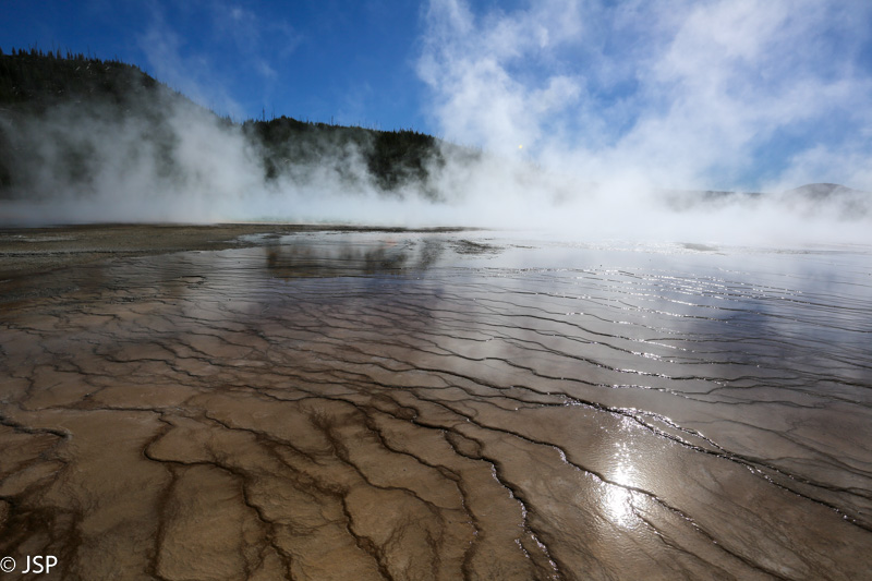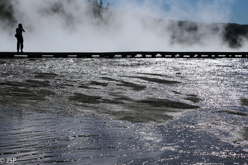 Grand Prismatic Spring prieigose beveik galima būtų pagalvoti, kad esi jūros pakrantėje per atoslūgį – tik garų debesys primena, kad tai yra labai ypatingas vandens šaltinis.