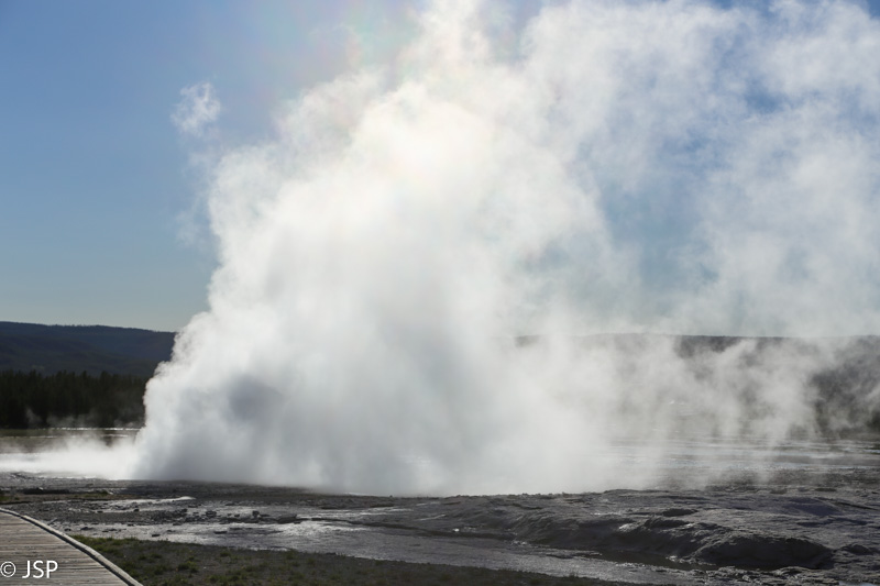 Spektaklis netrunka nei trijų minučių, ir netrukus virš geizerio vėl telieka tik nedidelis garų debesėlis. Žiūrovai ima skirstytis, mes irgi skubame prie mašinos, kad nepakliūtumėm į kamštį išvažiuojant iš parkingo. Iš esmės Old Faithful paliko lengvą nusivylimo jausmą – atėjau, pamačiau, paukščiuką užsidėjau, ir tiek. Bet nusivilti dar anksti, juk dar beveik nieko nematėme Yellowstone.