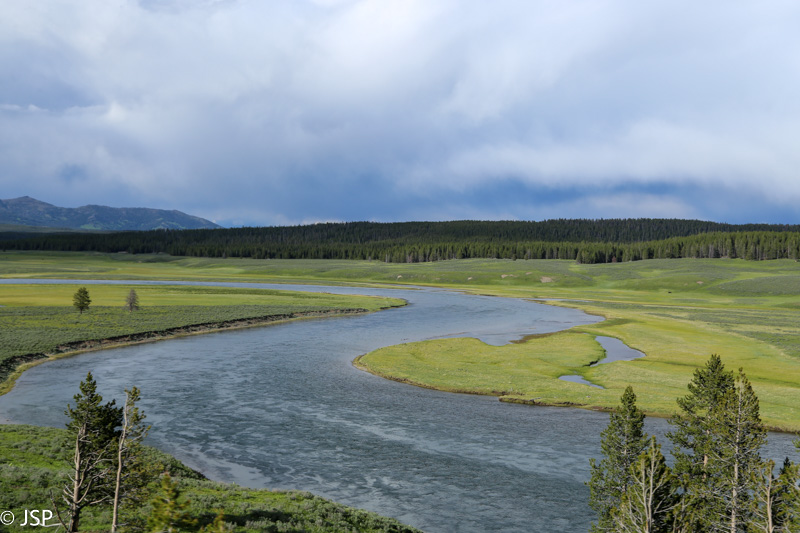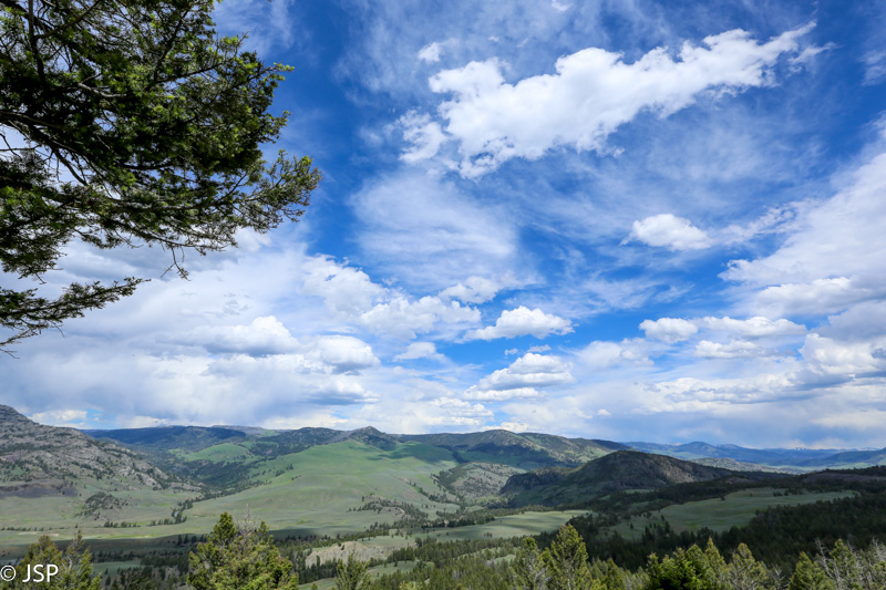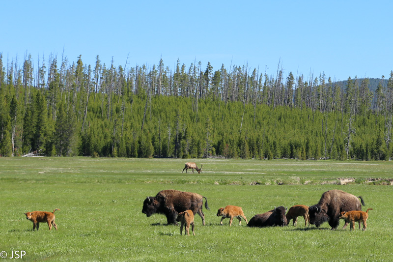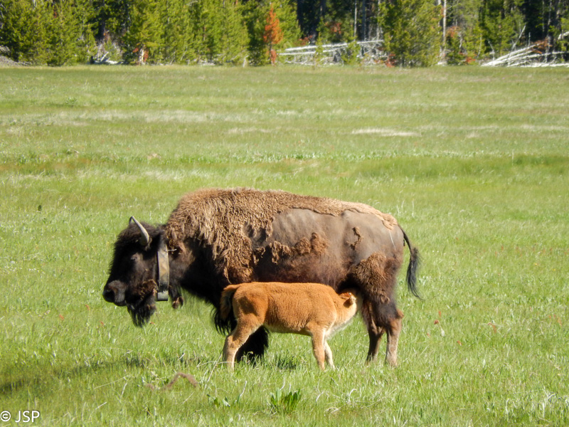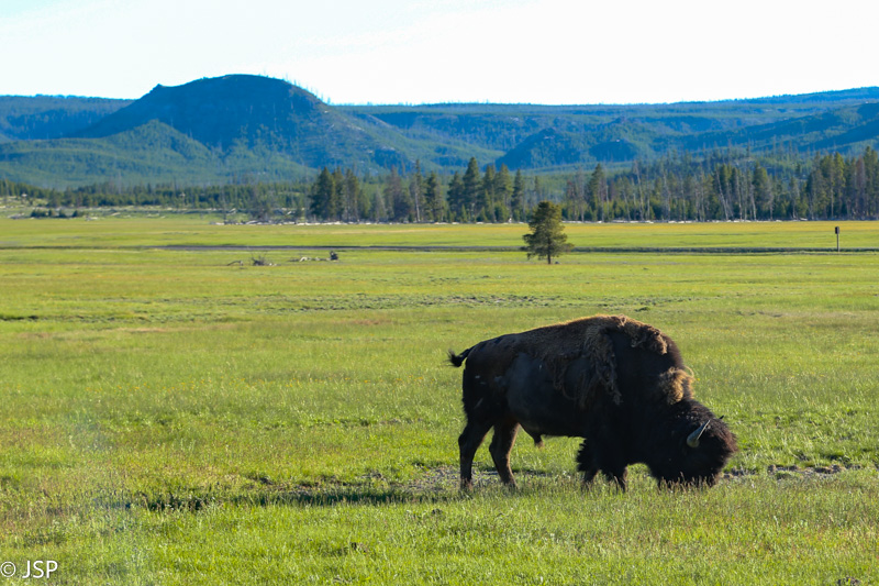 Po kurio laiko miškas atsitraukia, prasideda plačios pievos, aprėmintos tankiais eglynais, tolumoje baltuoja kalnai. Pievose ganosi bizonai su bizoniukais. Štai tokį aš ir įsivaizdavau Yellowstone nacionalinį parką!