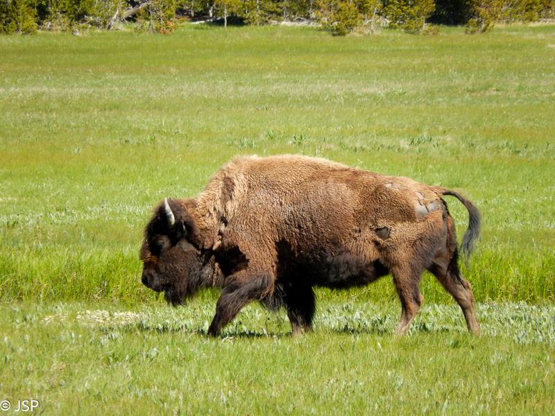 Pasiekę Madison Junction, sukame į dešinę ir per Lower Loop važiuojam link geizerių. Bet pirmiausia pamatome bizonus. Po to jų dar daug matėme, bet šitie pirmieji mums buvo kažkas tokio! Man šie didžiuliai flegmatiški gyvūnai taip tobulai dera su bekraštėm Yellowstone erdvėm…