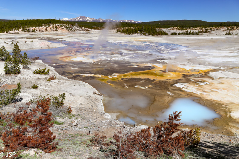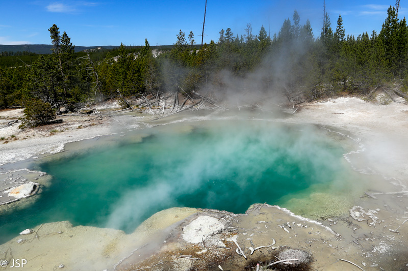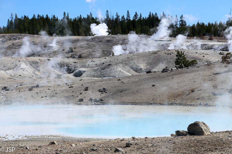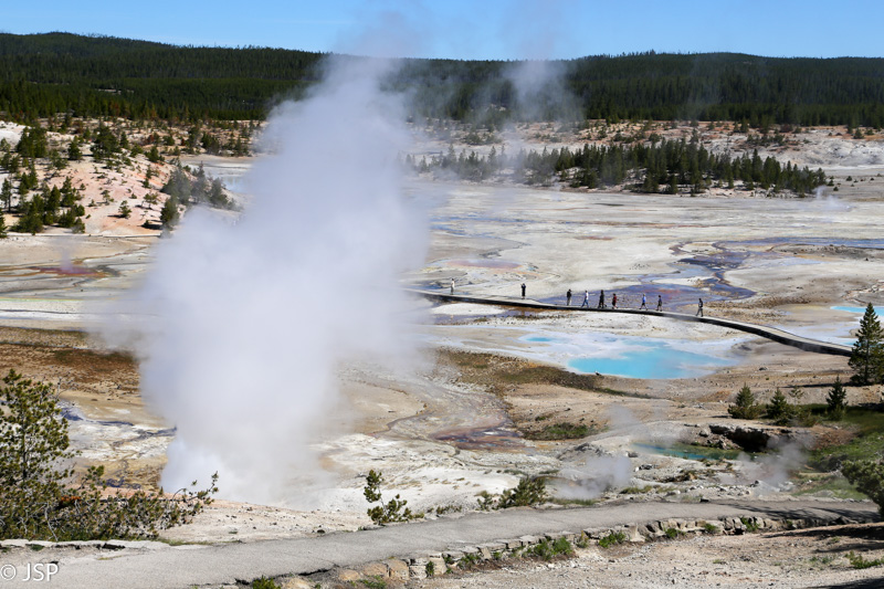 Privažiuojame Norris Junction ir svarstome: eiti ar neiti apžiūrėti Norris Geyser Basin? Geizerių iki soties prisižiūrėjome vakar, šiandien norėtume pamatyti visą Upper Loop, gal dar ir kokį žygį pavyktų į dienotvarkę įgrūsti. Iš kitos pusės, kaipgi dabar pravažiuosim ir neapžiūrėsim kažko? Susitariam, kad einam trumpai pasidairyti – ir kažkaip sugebam užtrukti pusantros valandos!