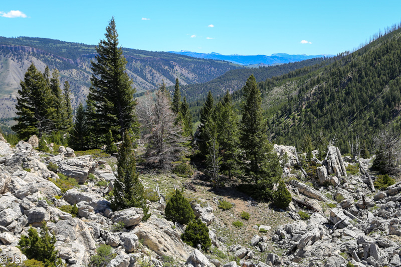 Netrukus randame mums patinkančia vietą. Stojame šalikelėje, leidžiamės žemyn ir įsitaisome ant didžiulio akmens sudoroti savo sumuštinių. Desertui – kalnų ir Blacktail ežerų panorama.
