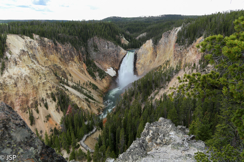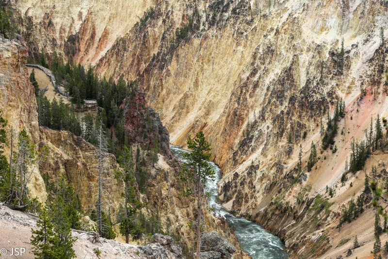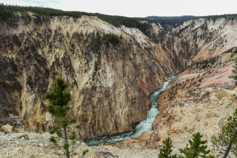 Apie penktą valandą pasiekiame Yellowstone Didįjį Kanjoną (Grand Canyon of the Yellowstone). Žemyn prie krioklių nesileidžiame, tik pasidairome į kanjoną nuo kelių apžvalgos aikštelių šiaurinėje pusėje (North Rim Drive): Brink of Lower Falls Trail, Red Rock Lookout, Inspiration Point. Nors dangus vėl apniuko, bet kanjonas vis tiek atrodo labai įspūdingai. Pasigailiu, kad nebeturime laiko praeiti planuota trasa pietiniu jo pakraščiu.