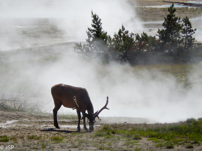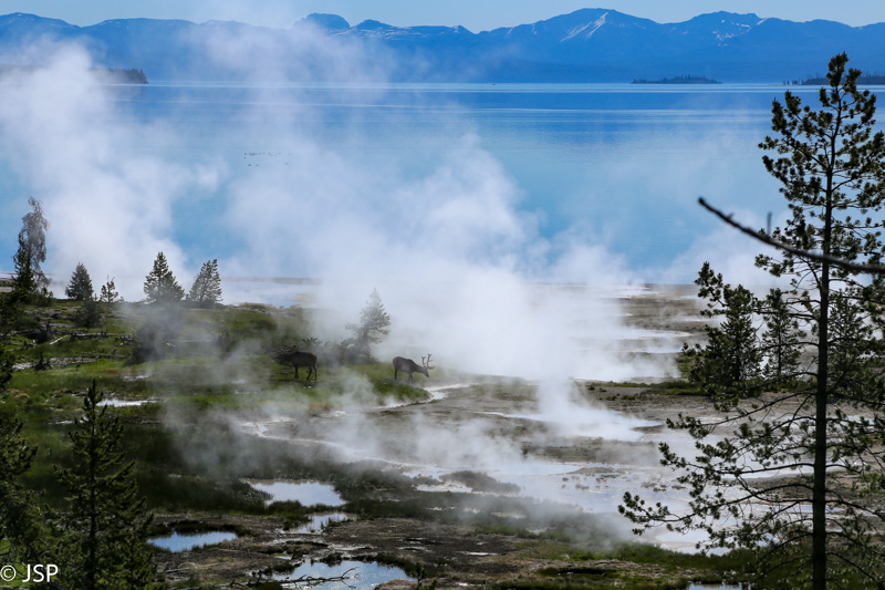 Pasiekę West Thumb sanryžą, pasukam link Yellowstone ežero. Daug laiko jam skirti neketinam, norim tik nuo kelio pasigrožėti. Ežeras ankstų rytą atrodo nuostabiai. Vanduo skaidriai mėlynas, jame atsispindi toks pat mėlynas dangus ir kalnų viršūnės – ar begali būti gražiau? Pasirodo, gali! Tuo įsitikiname, kai netrukus sustojame apžvalgos aikštelėje, pamatę ten besibūriuojančius žmones. Iš pradžių nesuprantam, į ką čia jie dairosi, nors vaizdas tikrai gražus. Netrukus vėjo gūsis nupučia šalin garų debesį ir pamatome ant ežero kranto tarp rūkstančių geizerių besiganančius du gražuolius elnius. Žiūriu į juos, fotografuoju ir tikrai žinau, kad būtent šis vaizdas man išliks kaip gražiausias prisiminimas apie Yellowstone: skaidrus šaltas ryto oras, mėlyni ežero vandenys, tolimi kalnai, pakrantę dengiantis karštas geizerių rūkas ir po jį klaidžiojantys didžiuliais ragais pasidabinę elniai.