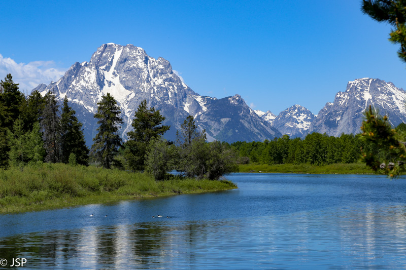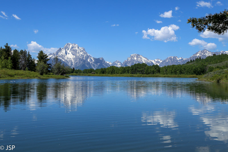Privažiuojam Jackson Lake Junction. Čia turim pasirinkimą: sukti į dešinę (Teton Park Road) ir važiuoti link Jenny Lake, pakeliui užvažiuojant į Signal Mountain viršūnę (ją galima pasiekti automobiliu) pasigrožėti parko vaizdais nuo viršaus, arba sukti į kairę (t.y. toliau važiuoti tuo pačiu 89-uoju keliu) link Oxbow Bend ir Snake River Overlook, dviejų iš nuotraukų pažįstamų vietų, kurias labai noriu pamatyti. Abejojame, ar spėsime pravažiuoti abu maršrutus, nes šiai dienai dar esame numatę kelių valandų žygį ir nenorime pakartoti vakarykštės klaidos, kai nesuplanavome savo laiko ir nespėjome pasivaikščioti palei kanjoną. Fotografė manyje nugali turistę, ir sukam į kairę. Netrukus sustojame prie Oxbow Bend Turnout. Esu mačiusi begalę šios vietos nuotraukų, bet tik prieš pat kelionę sužinojau, kad ji yra Grand Teton nacionaliniame parke. Savaime suprantama, man būtinai prireikė ją pamatyti!