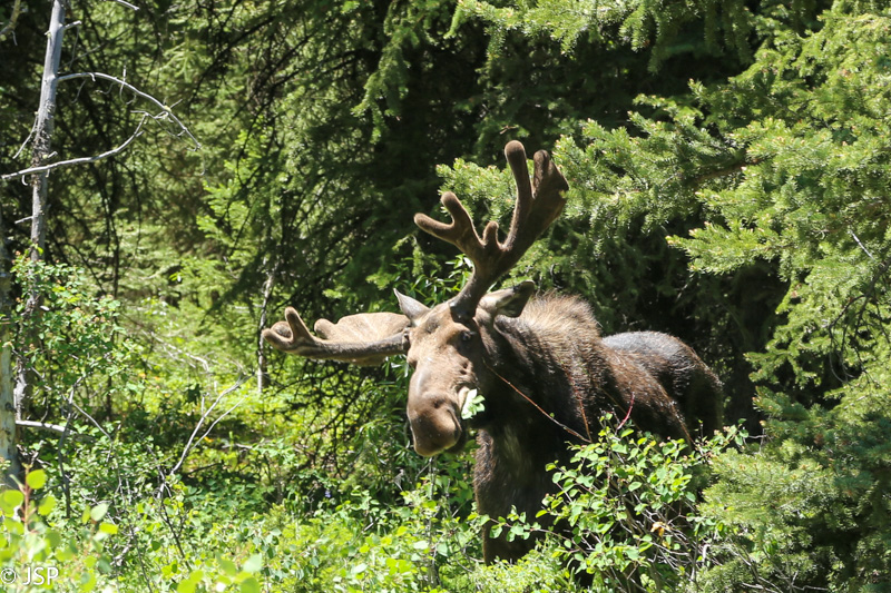Pasiekiame Moose Junction. Čia mums reikėtų sukti dešinėn, link įvažiavimo į parką (Moose Entrance). Bet sankryža ne be reikalo pavadinta briedžio vardu – miškelyje šalia kelio jaunais lapais užkandžiauja tikras briedis! Mašinų jau visa krūva sustojusi, vietos kelkraštyje nebėra, ir skirtingai nei Yellowstone, čia tvarką daro du reindžeriai. Vyras važiuoja toliau, kur nors saugiai pastatyti mašiną, o aš šoku lauk ir lekiu fotografuoti briedžio. To proceso metu du kartus gaunu pastabą iš pagyvenusio reindžerio – pirmąkart todėl, kad per arti priėjau prie briedžio, antrąkart – kad pasitraukiau per toli ir atsidūriau ant važiuojamos kelio dalies. Antrąkart dėdė reindžeris jau atrodė kiek susierzinęs, bet man tai nelabai rūpėjo – dėmesį tuo metu galėjau skirti tik tam gražuoliui briedžiui.