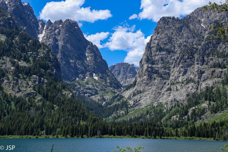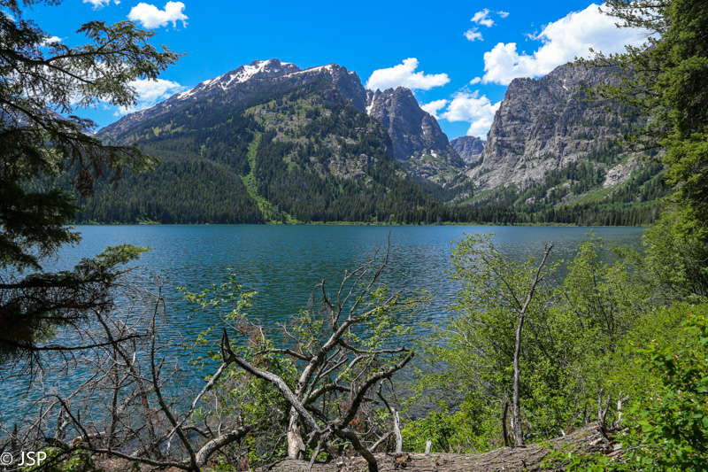 Pasiekiame tolimąjį ežero kraštą. Mūsų takas suka į pakrantę, o kitas takas vingiuoja stačiu šlaitu aukštyn ir tolyn nuo ežero – jis veda į kanjoną skambiu pavadinimu Death Canyon ir į keletą viršūnių už to kanjono. Tokiam ilgam žygiui neturime laiko, jam reikėtų visos dienos.