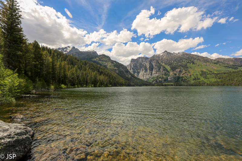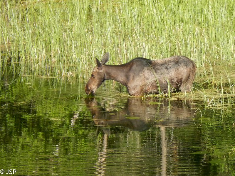 Labai patiko mums šis žygis aplink gražuolį Phelps ežerą, bet kaip visada užtrukome ilgiau nei planavome – keturias valandas. Kai grįžtame prie mašinos, jau beveik šešios. Važiuodami atgal link Moose Junction, svarstome, ar sukti į šiaurę, link Jenny Lake, ar važiuoti į pietus, į Jackson, kur ketiname nakvoti. Apsispręsti padeda briedžiai – tiksliau, briedė, įbridusi į upę atsigerti. Kol pasigėrim, kol nufotografuojam, saulė dar šiek tiek arčiau laidos pasislenka.