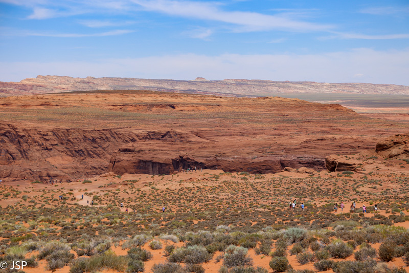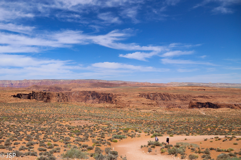 Užtrunkam prie Horseshoe Bend beveik valandą – net nesitikėjom, kad mums čia taip patiks, manėm, ateisim, nufotografuosim, ir atgal. Per tą laiką jau visai įdienojo, pats vidurdienis, saulė pleškina kaip pašėlusi, kopti į smėlio kalną visai neįdomu – bet pagaliau užkopiam, dar kartą nuo viršūnės pasižiūrim į kanjoną (nežinodamas net neįtartum, kad nuo jo krašto atsiveria toks svaigus vaizdas) ir grįžtam prie mašinos.