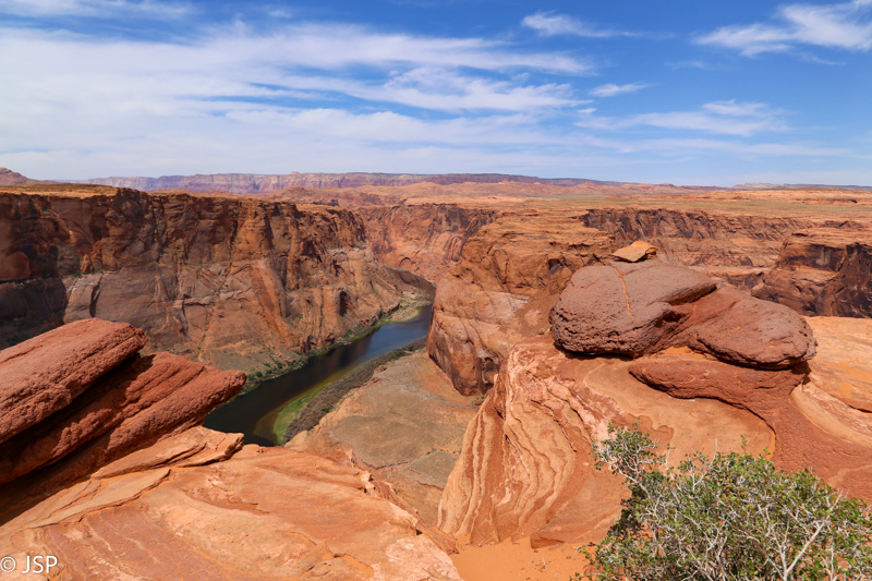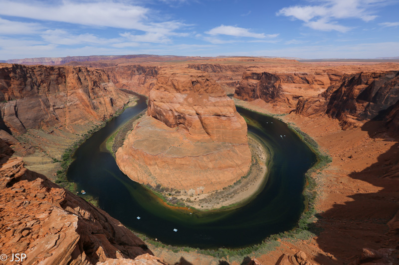 Giliai kanjono dugne – melsvai žali Kolorado upės vandenys. Žiūriu į upe plaukiančius laivelius ir plaustus, iš tolo panašius į žaislinius, ir galvoju, kad jei turėtume dar vieną dieną, mielai pasilikčiau Page ir paplaukiočiau plaustu Kolorado upe. O dar labiau norėtųsi praeiti kilometrą kitą kanjono pakraščiu, bent jau iki to tolimojo posūkio, kad būtų galima pasižiūrėti į „pasagą“ iš kitos pusės.