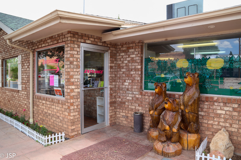 Po valandos pasiekiam Kanab miestelį ir einam pietauti į “Trijų meškų kavinę” (Three Bears Cafe). Šią kavinę irgi iš anksto buvau susiradusi Tripadvisor ir Google Maps pagalba. Ši taktika – iš anksto apsižiūrėti, kur būtų galima pavalgyti – labai pasiteisino šios kelionės metu, ypač tokiom dienom kaip ši, kai nesinori gaišti laiko ieškant tinkamų kavinukių pakelės miesteliuose. Kavinė – nepretenzingas vienaaukštis mūrinukas, viduj visi savi ir tarpusavy pažįstami, o turistai tik mes vieni, bet niekas į mus nespokso, tik santūriai apžiūri ir vėl visi grįžta prie savo reikalų. Pavalgom labai skaniai. Netgi prisimenu, ką ten valgiau – baltos duonos sumuštinį su karštu jautienos įdaru ir ypač skaniom šviežių kopūstų salotom. Toks, sakyčiau, naminis maistas, labai skanu buvo.