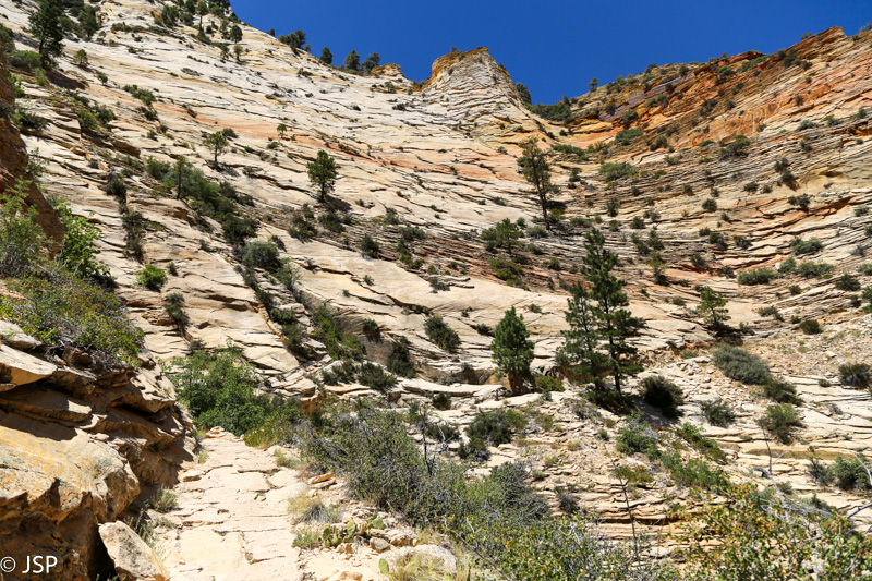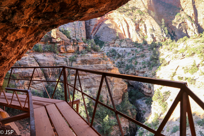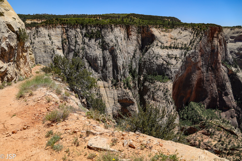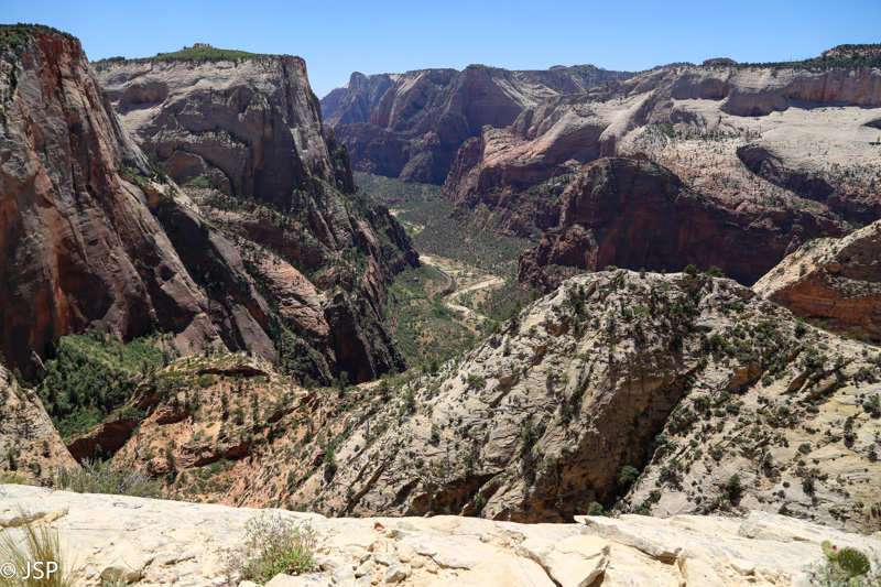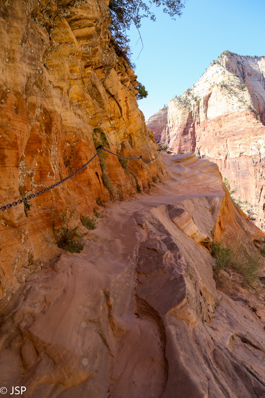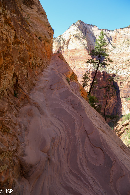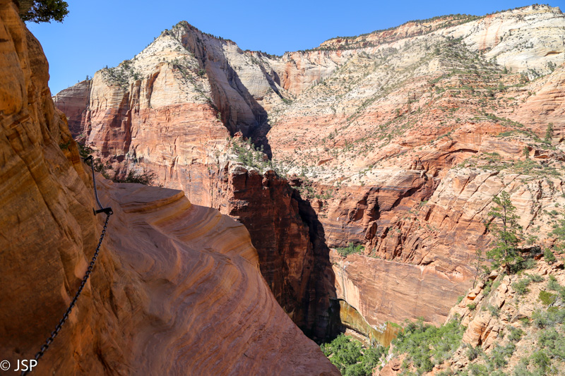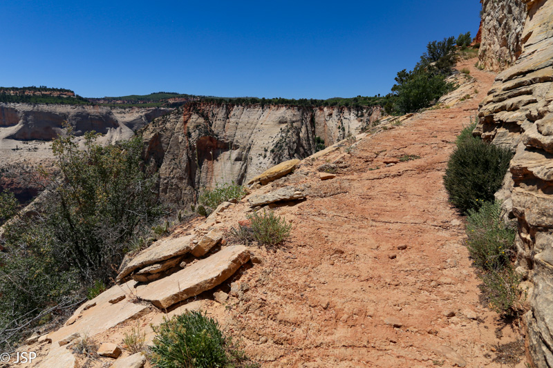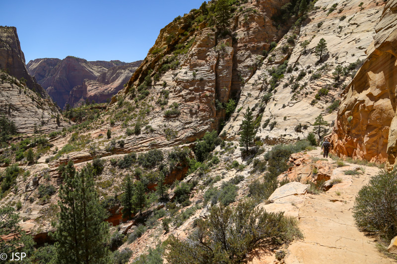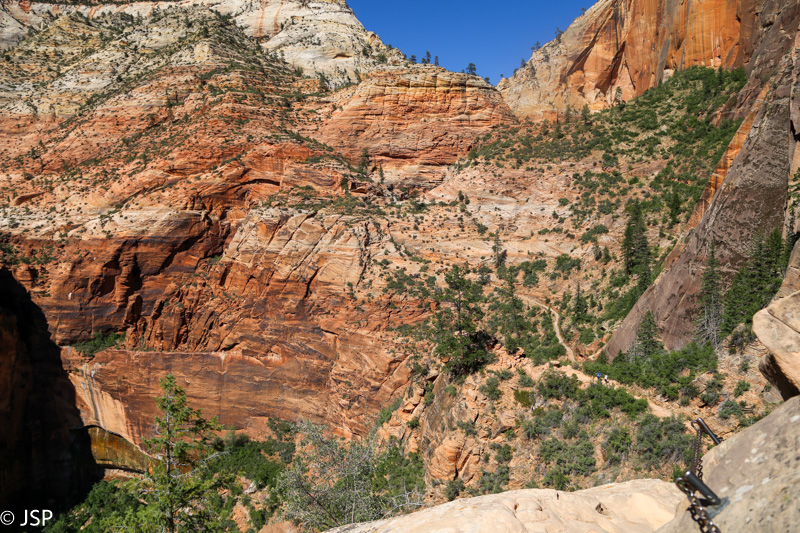 Pasisotinę vaizdais nuo Observation Point, tuo pačiu taku grįžtam iki kryžkelės, kur susijungia East Mesa ir Observation Point trasos, ir pradedame leistis žemyn. Takas labai vaizdingas ir iš pradžių dar nelabai status, tad eiti lengva, nors bijantiems aukščio jis turbūt sukeltų šiokių tokių problemų. Vyras apdairiai laikosi arčiau uolų, juolab kad šiandien labai vėjuota – ypač ties posūkiais gūsiai tokie, kad stovint ant krašto ir nupūsti gali, o bedugnė apačioj – labai gili.