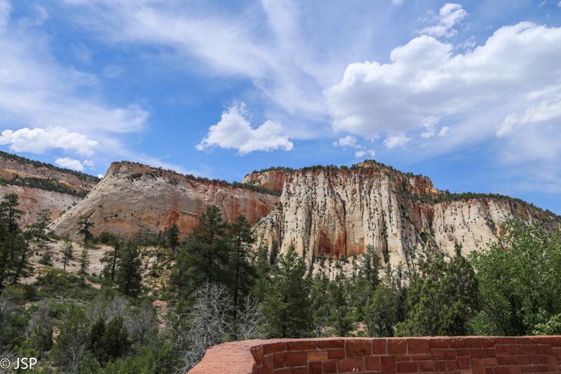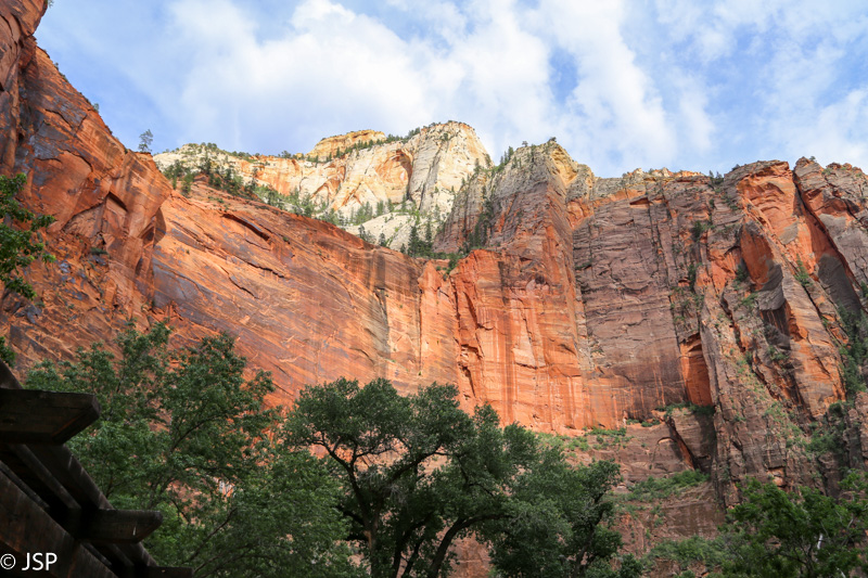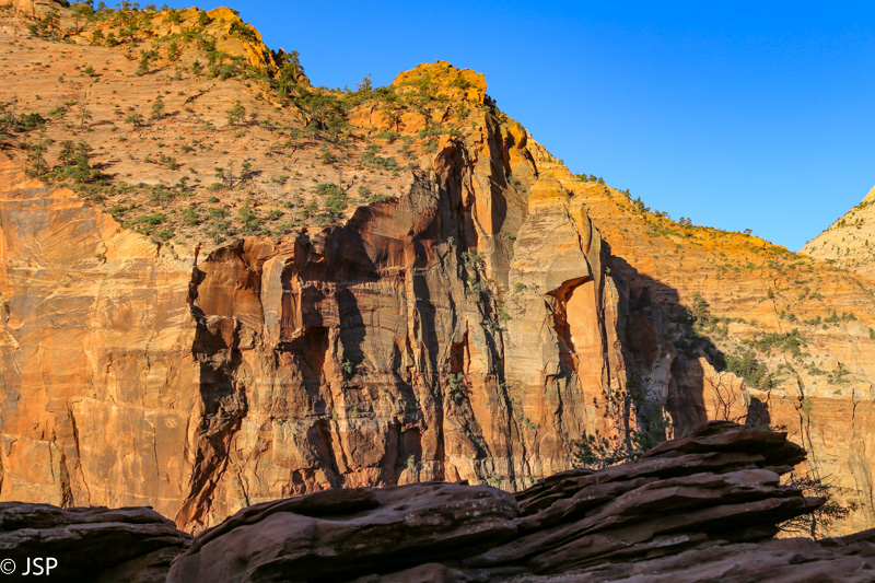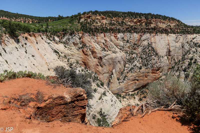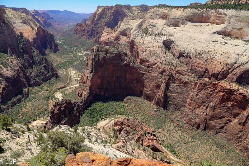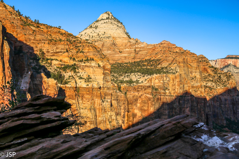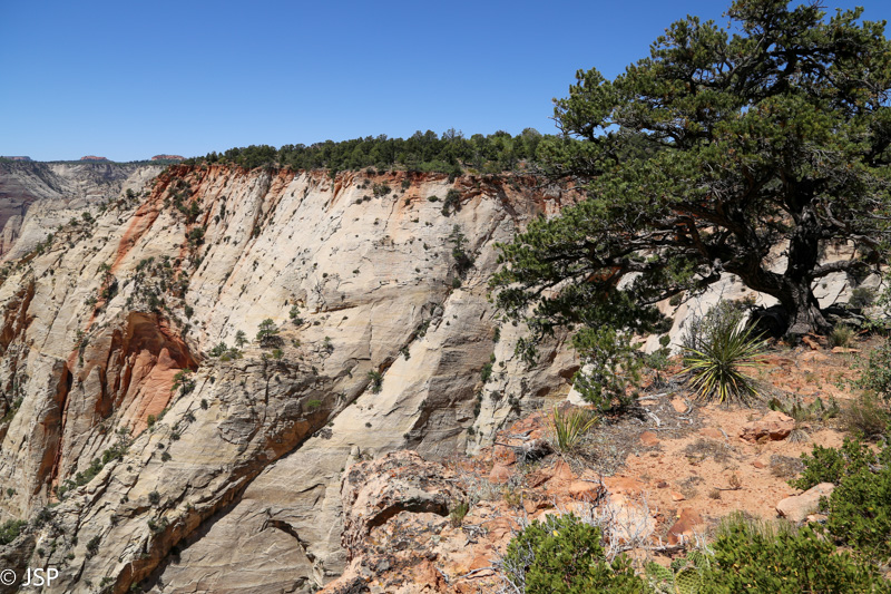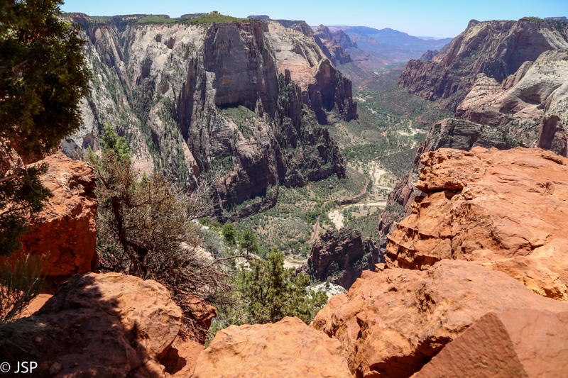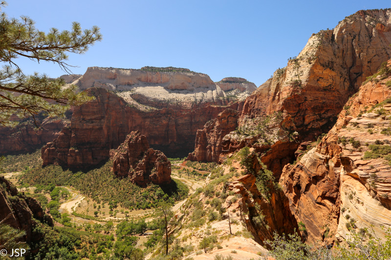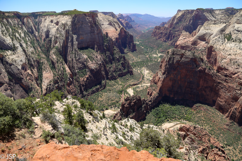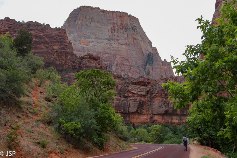 Pasisotinę vaizdais nuo Observation Point, tuo pačiu taku grįžtam iki kryžkelės, kur susijungia East Mesa ir Observation Point trasos, ir pradedame leistis žemyn. Takas labai vaizdingas ir iš pradžių dar nelabai status, tad eiti lengva, nors bijantiems aukščio jis turbūt sukeltų šiokių tokių problemų. Vyras apdairiai laikosi arčiau uolų, juolab kad šiandien labai vėjuota – ypač ties posūkiais gūsiai tokie, kad stovint ant krašto ir nupūsti gali, o bedugnė apačioj – labai gili.