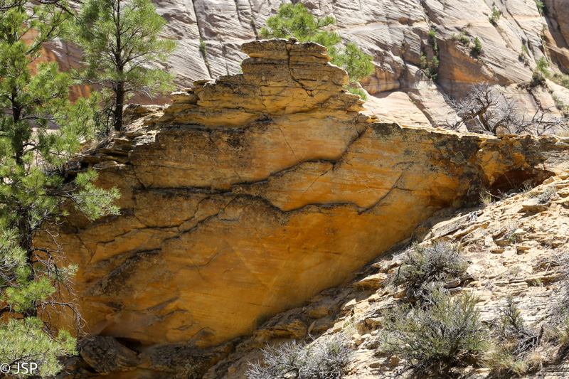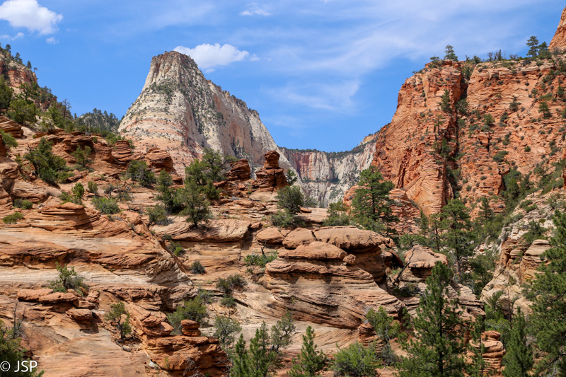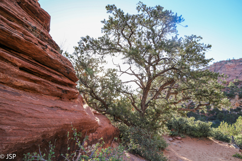 Mūsų takas suka į dešinę ir susijungia su Observation Point trasa. Iki šiol beveik nesutikome kitų žygeivių (East Mesa trasa – labai nuošali), bet šiame take eismas gana intensyvus. Jaučiame, kad jau artėjame prie tikslo.