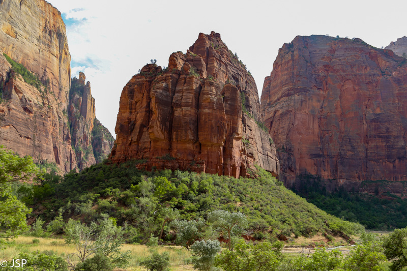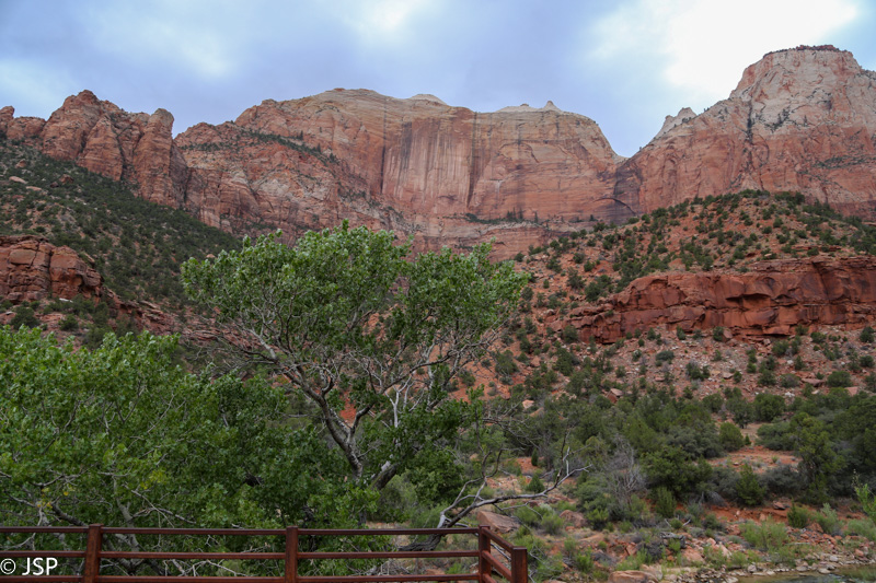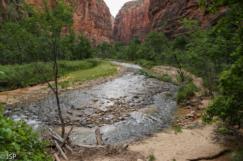 Autobusas sukasi ir grįžta atgal, o mes su minia kitų turistų einam prie upės ir pradedam Riverside Walk – ko gero, lengviausią žygį (greičiau gal pasivaikščiojimą) Zione. Asfaltuotas takelis vingiuoja palei Virgin upę, pakilimai ir nusileidimai labai nežymūs, keliose vietose galima prieiti pat prie kranto, pabraidžioti ar pasėdėti prie vandens. Dangus apsiniaukęs, karšta ir drėgna, o dar pilna kažkokių įkyrių mašalų, matyt dėl to, kad vanduo visai šalia. Nuo tokio oro ima miegas, kojos sunkios ir nenori judėti, bet stengiamės nepasiduoti tai migdančiai įtakai ir neskubėdami žygiuojam tolyn.