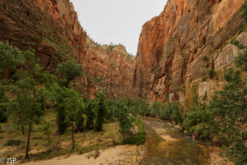 Takas pasibaigia, kai kanjono siena visai priartėja prie upės kranto. Čia prasideda The Narrows trasa, viena iš populiariausių Zione. Einama tiesiai upe aukštyn, tiek, kiek norisi eiti (jei einama iki galo, šis trasos variantas baigiasi ties Big Springs), ir paskui tuo pačiu keliu (t.y. ta pačia upe) grįžtama atgal. Labiau patyrę arba labiau nuotykių ištroškę žygeiviai renkasi atvirkščią Narrows trasos variantą, prasidedantį prie Chamberlain Ranch rytinėje parko pusėje (iš Springdale ten veža kelių firmų autobusiukai – aišku, mokami) ir kanjonu/upe vedantį žemyn – 16 mylių žygis, su nakvyne arba be. Na o tie, kas tiesiog nori išbandyti ėjimą upe tarp stačių kanjono sienų, renkasi trasą upe aukštyn, kuri prasideda štai čia, Riverside Walk galutiniame taške. Šis trasos variantas pats populiariausias, nes nereikia nei leidimų, nei ypatingo pasiruošimo. Jau visai pavakarė, bet sekli upės vaga pilna į žygį besiruošiančių arba ką tik iš jo grįžusių žmonių. Dauguma grįžusių švyti plačiom šypsenom, bet kai kurie atrodo labai pavargę – jie tikriausiai atėjo nuo Chamberlain Ranch.