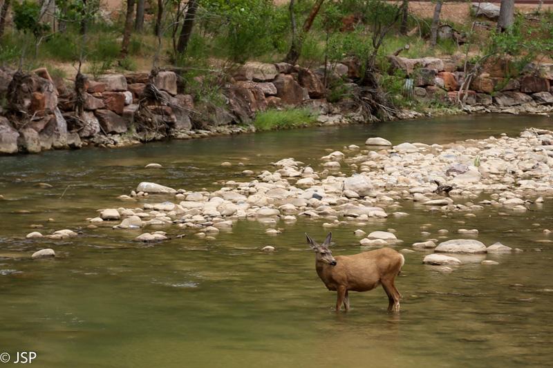 Kai vėl pasiekiame The Temple of Sinavawa, atskleidžiu vyrui savo slaptąjį planą – paupiu paeiti iki sekančio sustojimo, The Big Bend, ir jau ten lipti į autobusą. Eiti netoli, gal kokia mylia. Vyras iš pradžių burba, kad tik be reikalo pavargsim, kad upę jau matėm, o čia net aiškaus tako nėra… bet iškart nutyla, kai pamatome upės viduryje tyru vandenėliu besigaivinančią elnę.