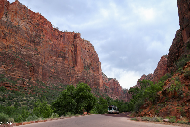 Apsimėtę daiktus, pirmiausiai užsukam į supermarketą ir apsirūpinam pusryčiais rytdienai. O tada jau pakuojamės kuprines ir lekiam į parką, prie nemokamo autobuso sustojimo. Zion kanjonas (tiksliau, didžioji jo dalis) uždarytas automobiliams, bet kas keliolika minučių kanjonu kursuoja nemokamas parko autobusas. Per maždaug valandą jis nuveža turistus nuo pietinio įėjimo iki kanjono pabaigos, su tarpiniais sustojimais šešiuose ar septyniuose strateginiuose punktuose, iš kur galima pradėti žygius į įvairias kanjono vietas. Mūsų šios dienos tikslas – paskutinis sustojimas, Temple of Sinavawa.