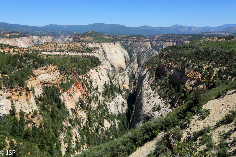 Šioje nuotraukoje matosi visas takas į Hidden Canyon – taip, kaip jį matėme nuo kanjono viršaus, artėdami prie Observation Point. Matosi ir paties kanjono pradžia (miško juosta dešinėje viršuje, į dešinę nuo tos didžiulės uolos.) Įspūdingas takelis, ane? Gerai, kad ir nežinojom, jog tai yra būtent tas anksčiau matytas takas, nes turbūt būtume nelipę juo aukštyn.