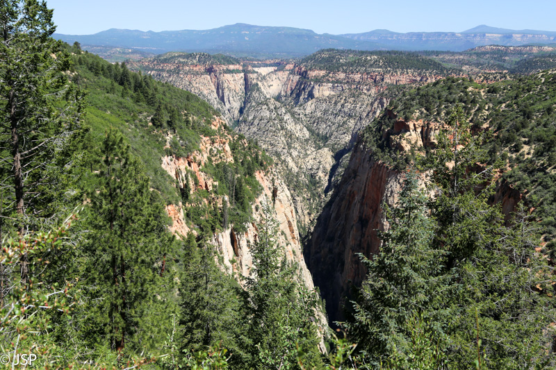 Miško takas vaizdingumu nepasižymi, bet dešinėje pro medžių properšas matome uolas kitoje kanjono pusėje. Užsinorėjus vaizdų, tereikia paeiti šiek tiek į šalį nuo tako. Taip netrukus ir padarome – paeiname kiek toliau į mišką ir prisėdame pailsėti ant skardžio krašto. Toli apačioje matome gilų siaurą kanjoną, statmenai kertantį tą, kurio viršum mes dabar einame. Tai Paslaptingasis kanjonas (Mystery Canyon), vienas iš taip vadinamų technical canyons, todėl į jį nepatariama eiti, neturint specialios įrangos, be to, dar reikia turėti specialų leidimą, kurių išduodama tik 12 dienai. Nematome ir jokio akivaizdaus tako, kuriuo nuo mūsų trasos būtų galima nusileisti iki to kanjono, taigi tik iš tolo į jį pasižiūrim.