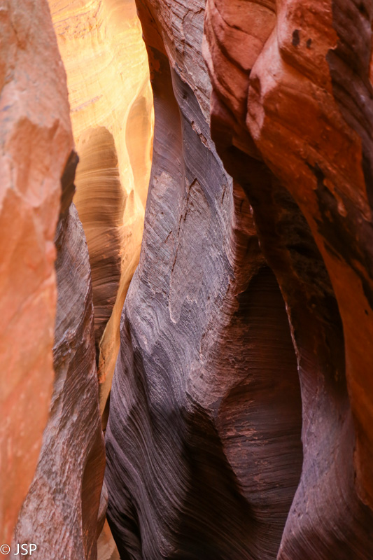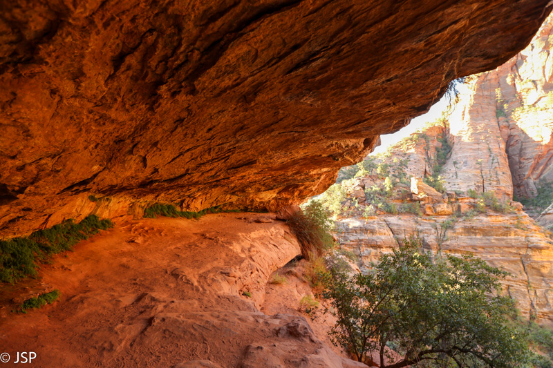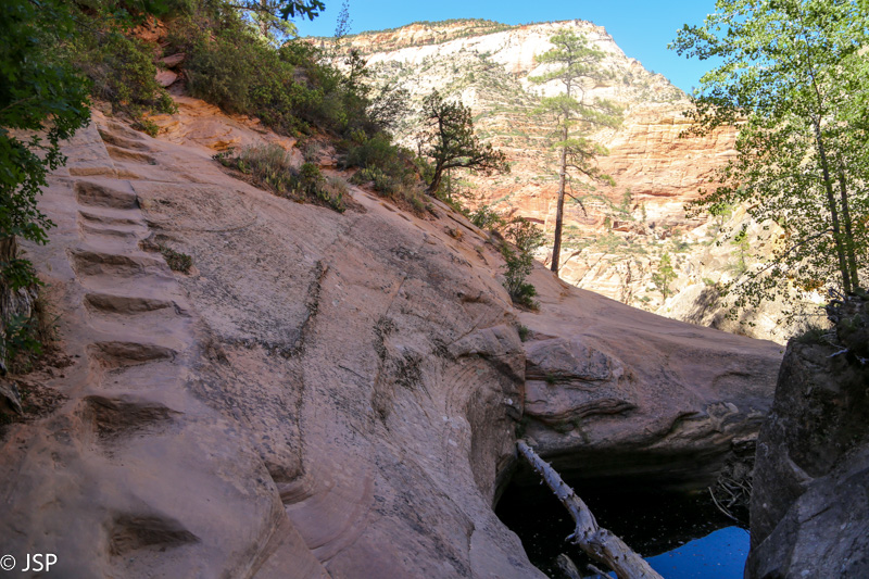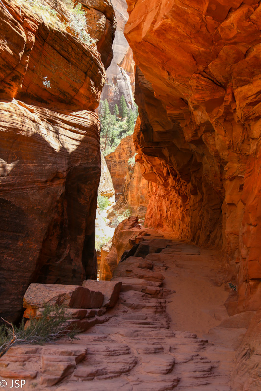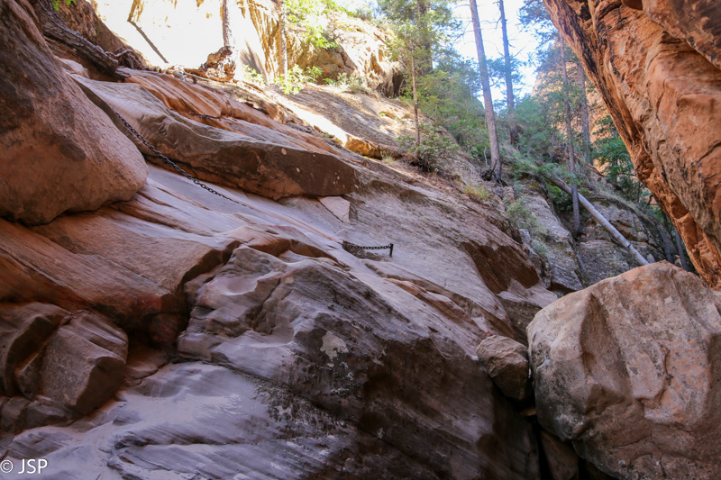 Bet, pasirodo, per anksti įjungėm nuobodžiavimo režimą! Prisimenat tą nuo uolos besileidžiantį serpantiną, kurį matėme nuo kanjono viršaus? Ir spėliojome, kur veda nuo jo atsišakojantis mažesnis, aukštyn kylantis serpantinas? Kaip tik ir prieiname tą kryžkelę (tik patys dar to nežinome). Pasirodo, tas aukštyn kylantis takas veda link Paslėptojo kanjono (Hidden Canyon). Dar nesijaučiam labai pavargę, ir diena dar ne vakarop, taigi nusprendžiam palypėti aukštyn ir pasižiūrėti į tą kanjoną. Kažkodėl manom, kad jis visai netoli, bet lipam vis aukščiau, takas statėja, o galo vis nematyt. Sutiktas pagyvenęs vyriškis, einantis žemyn, dar papasakoja, kad pabaigoje reikės eiti grandinėm tiesiai per uolas virš bedugnės ir kad jis dėl tos priežasties pasukęs atgal. Vyras pareiškia, kad toliau neis, bet aš jį prikalbinu paėjėti nors iki tų grandinių pradžios. Galiausiai palei uolą vingiuojantis takas atsiremia į pavėsyje skendintį miškingą šlaitą. Kiek toliau prasideda aukšti ir labai statūs akmeniniai laiptai, jų viršaus nematyti, ir kur toliau eina takas, irgi neaišku. Prisėdam pailsėti pavėsyje po didžiuliais akmenim. Aš svarstau, lipti tais laiptais ar ne – po stataus kopimo aukštyn jaučiuosi kiek pavargusi, be to, nežinia, kur tas takas eina, gal vėl aukštyn, per mišką, o man jau gana ir kopimo aukštyn, ir miško. Bet kiek pasėdėjusi visgi nusprendžiu palypėti bent jau iki laiptų viršaus ir pažiūrėti, kas ten laukia. Užlipus viršun, takas sukasi atgal beveik 180 laipsnių kampu ir kyla aukštyn tiesiai per uolas. Ir grandinės yra, visai kaip tas vyriškis pasakojo. Aišku, man reikia tą taką išbandyti! Vyras prisakė labai toli neiti, bet aš žinau, kad jis nesitiki, jog aš jo klausysiu. Siauras uoloje iškirstas takas vingiuoja aplink gelsvo akmens kalną ir pamažu kyla aukštyn.