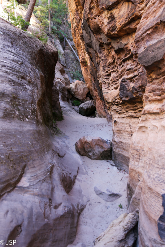 Galiausiai takas vėl atsiremia į mišku apaugusį kalno šlaitą. Čia ir prasideda Paslėptasis kanjonas – tokį vardą jis gavo, spėju, todėl, kad pamatyti jį galima tik apėjus didžiulę uolą. Kanjono pradžioje kabo lentutė su perspėjimu, kad kiekvienas pats turi nuspresti, kiek toli pajėgs eiti. Aš nueinu nelabai toli, gal porą šimtų metrų – pamačiusi didžiulius akmenis ir grandinėm sutvirtintą taką aukštyn, pasuku atgal. Juolab ir taip jau per ilgai užtrukau.