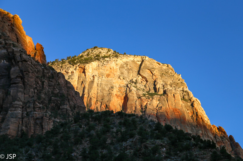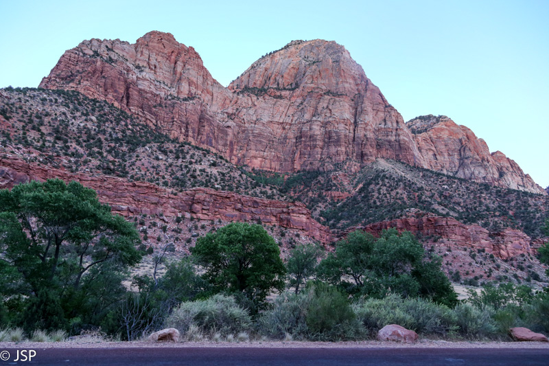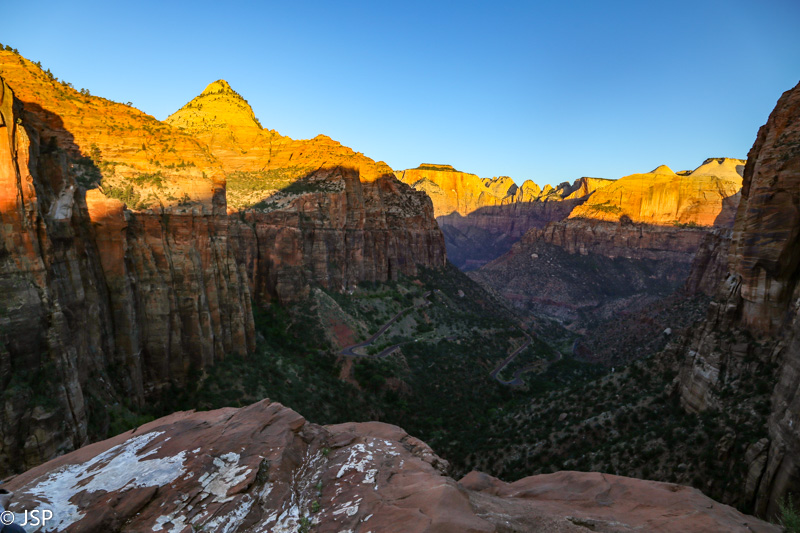 Saulėtekis jau prasidėjęs, bet kol kas saulė auksina tik pačias kalnų viršūnes. Didžioji slėnio dalis dar skendi prietemoje, fotografuoti nėra ką – net ir žiūrėti nelabai yra į ką, viskas aplink dar persmelkta pilkos priešaušrio spalvos. Prisėdame ant uolų, aš išsitraukiu megztuką, nes čia vėsoka, ir mėgaujamės tyla ir ramybe, laukdami, kol saulė pakils aukščiau. Laukti ilgai netenka – gal po dešimties minučių kalnai virš kanjono jau dažosi saulėtekio spalvom. Saulė sparčiai kopia aukštyn, šešėliai nenoriai traukiasi. Žemai slėnyje, vis dar giliame šešėlyje – Route 9, kelias, kuriuo važiavome užvakar ir gėrėjomės kvapą gniaužiančiais kanjono vaizdais.