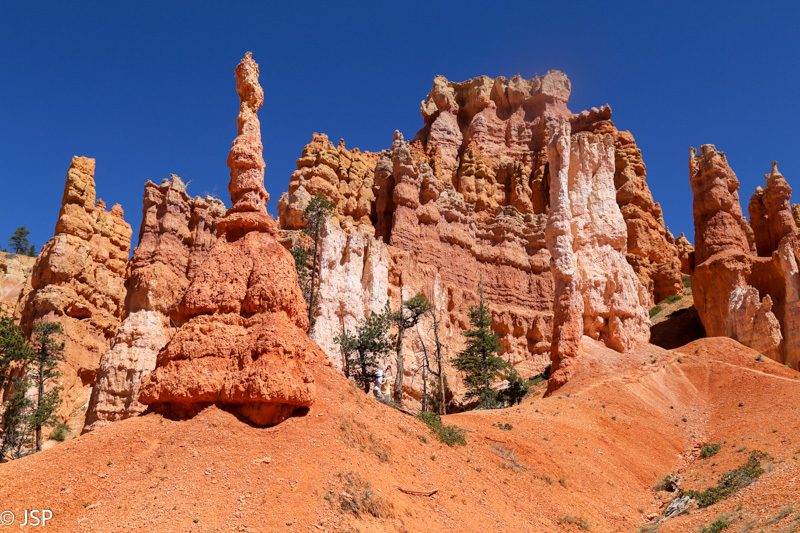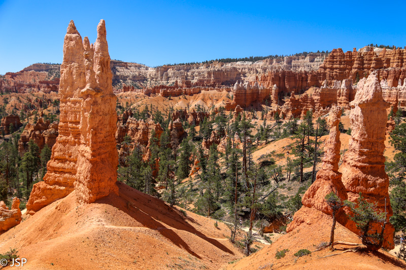 Stačiu takeliu leidžiamės žemyn, iš visų pusių apsupti į dangų besistiebiančių hoodoo.