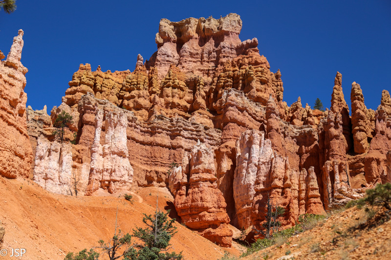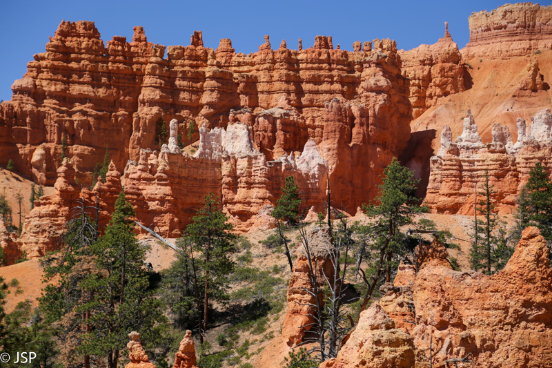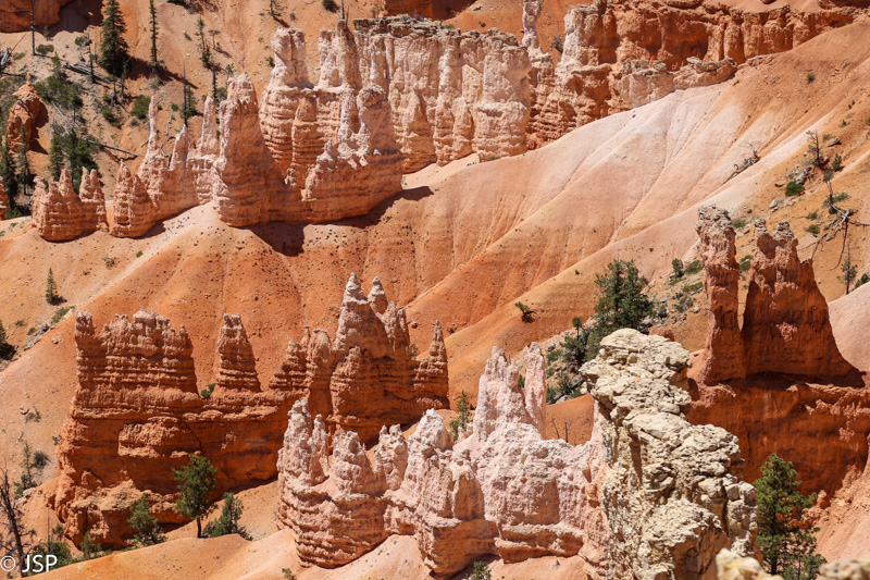 Queen‘s Garden – ant kelių žvyro kalniukų tankiai susigrūdę balti ir rausvi hoodoo, tik jokių sodų man jie neprimena, gal nebent kiparisų mišką. Kažkur dar skaičiau, kad pasitelkus fantaziją, galima įsivaizduoti, kad vienas iš hoodoo – tai karalienė Viktorija, apžiūrinėjanti savo sodus. Bandau, bet man nieko nesigauna.