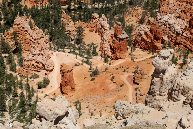 Apačioje tarp uolų vingiuojantis takelis – Peekaboo Loop trasa. Labai norėjau ja praeiti, bet dėl laiko stokos pasirinkom trumpesnę trasą.